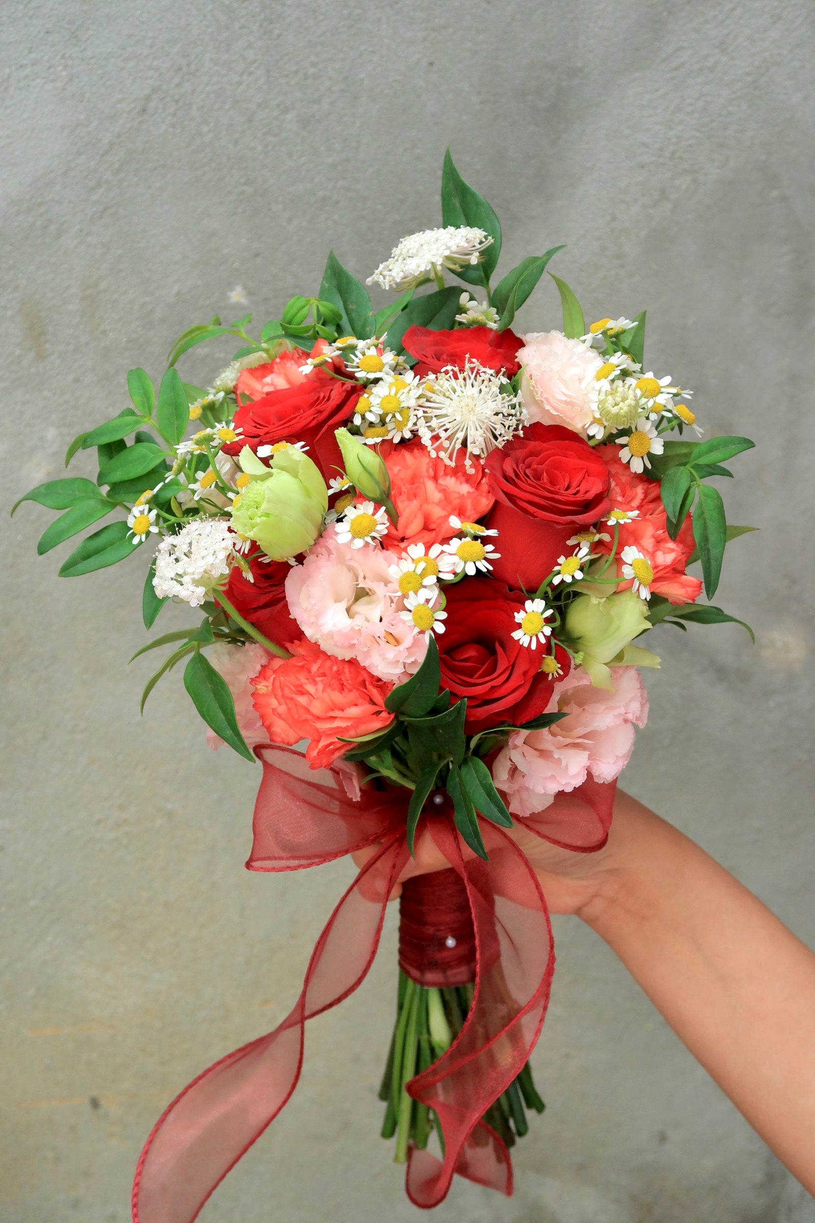 This flower arrangement includes red rose (5 stems), carnation, eustoma, camomile, trachymene coerulea and foliages.