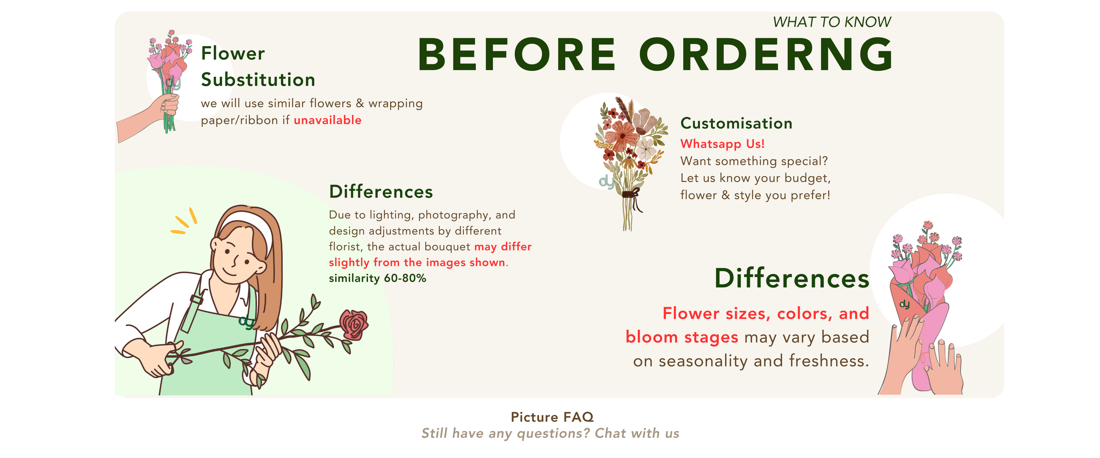 For corporate events or bulk orders, we offer tailored services to meet your needs. We provide custom floral arrangements that reflect your brand. Whatsapp us directly for special pricing and to discuss your requirements.