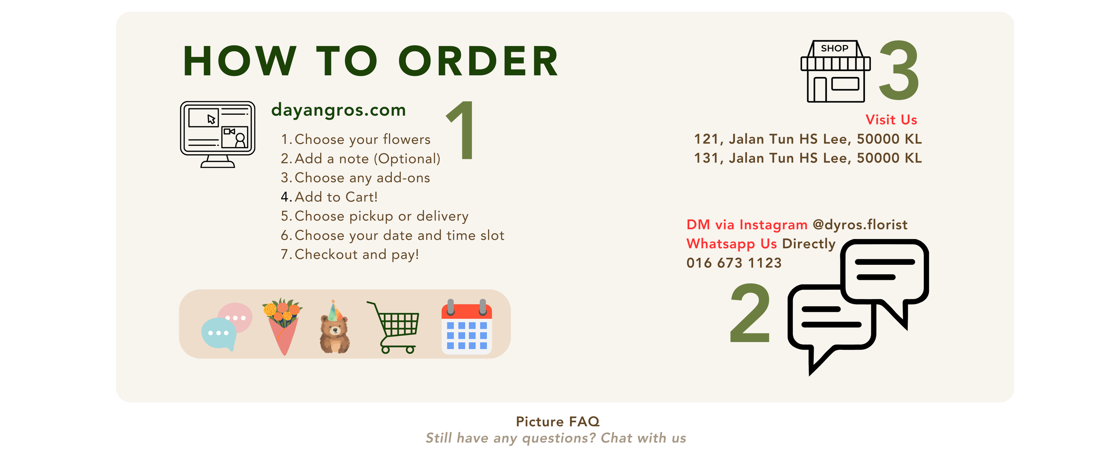 Yes! Visit us at Petaling Street KL. You can pick the flowers you want and we offer affordable packaging services to help you transform into a bouquet on the spot!