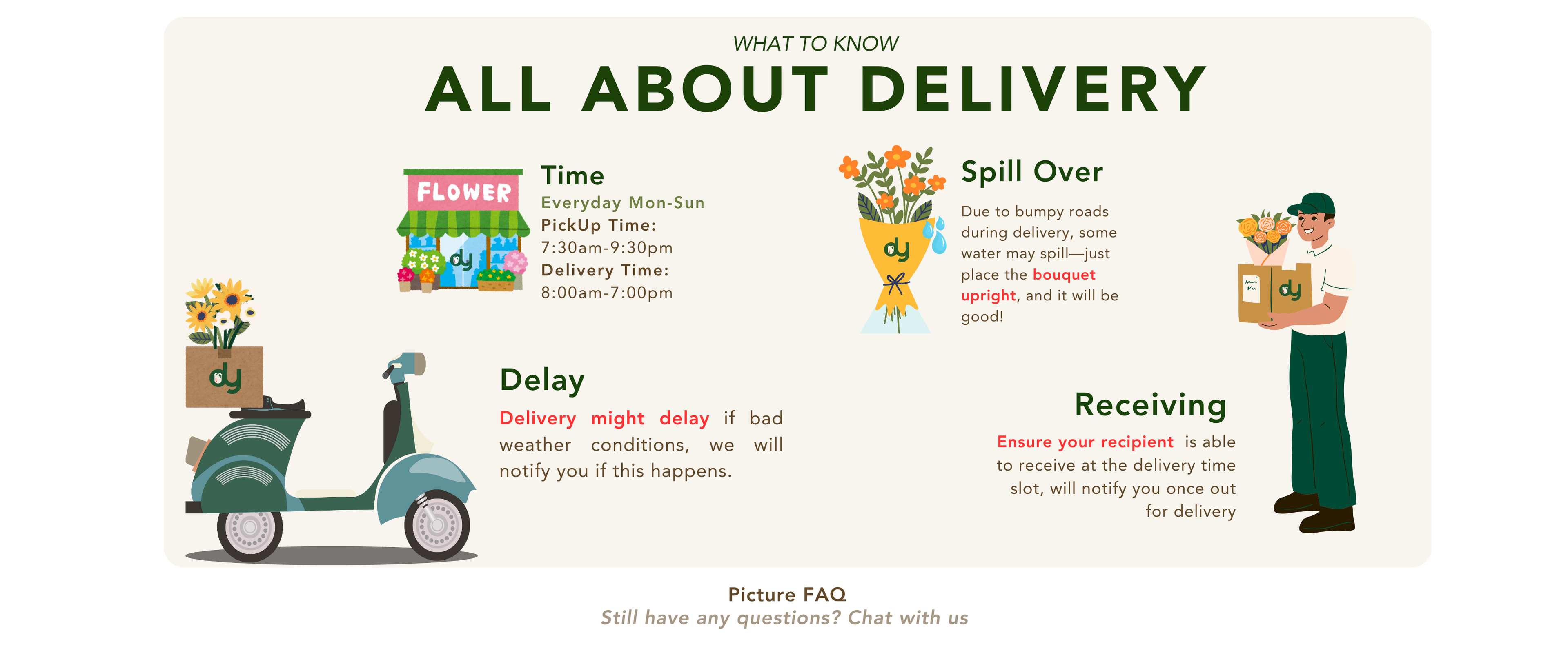 Kindly ensure the recipient is available to receive the order within the stipulated delivery time. If redelivery is required due to the recipient's unavailability, additional delivery charges will apply.