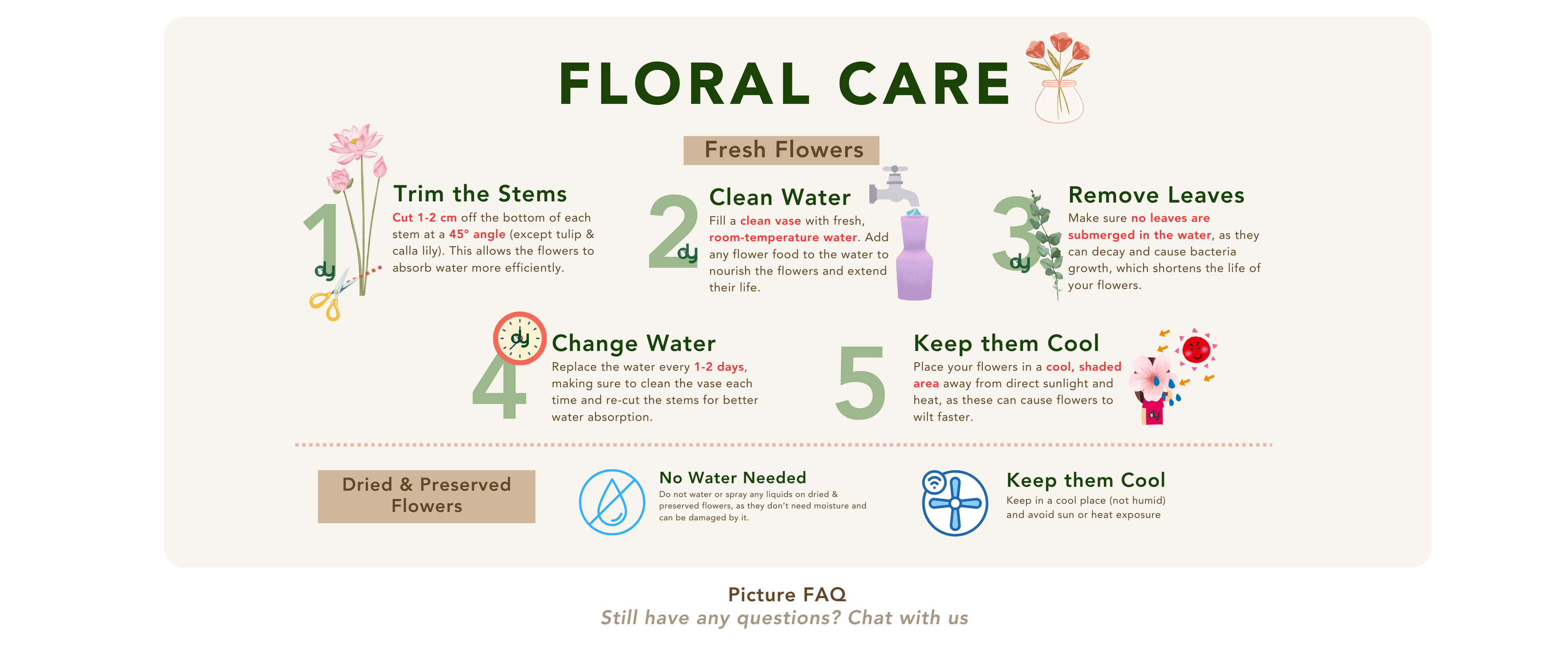 - Handle with care—preserved flowers are delicate and should not be bent or crushed.
