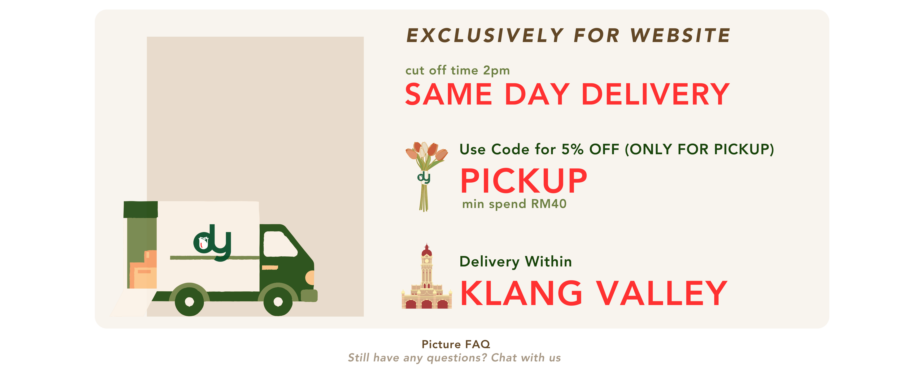 Delivery is within KL and Selangor. We provide delivery (everyday 8am to 7pm) and pickup (everyday 7:30am-9:30pm).