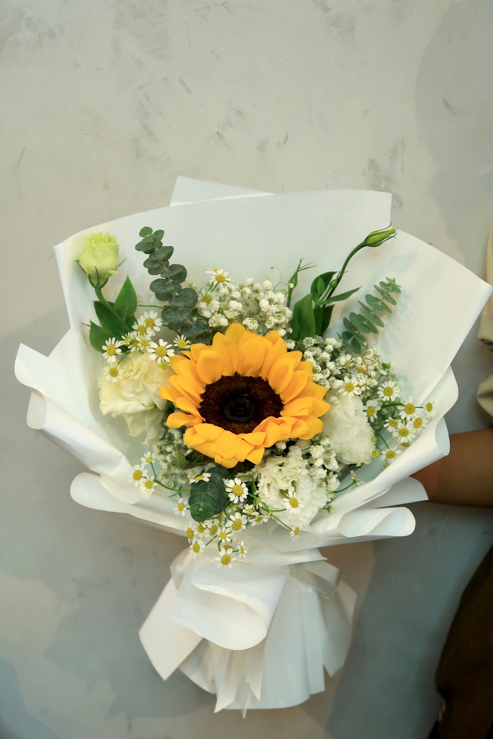 This flower arrangement includes sunflower, eustoma, chamomile and foliages.