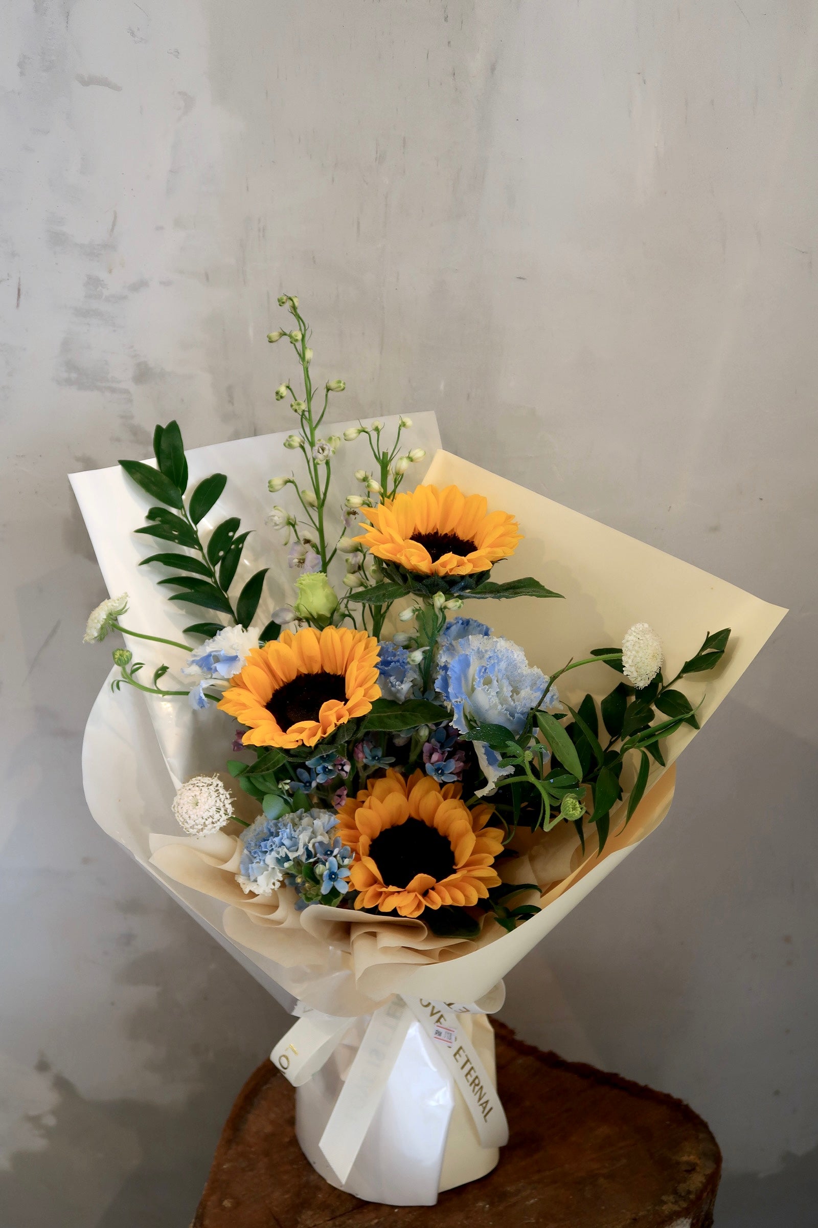 This flower arrangement includes sunflower, eustoma, oxypetalum blue, lace flower, delphinium and foliages.