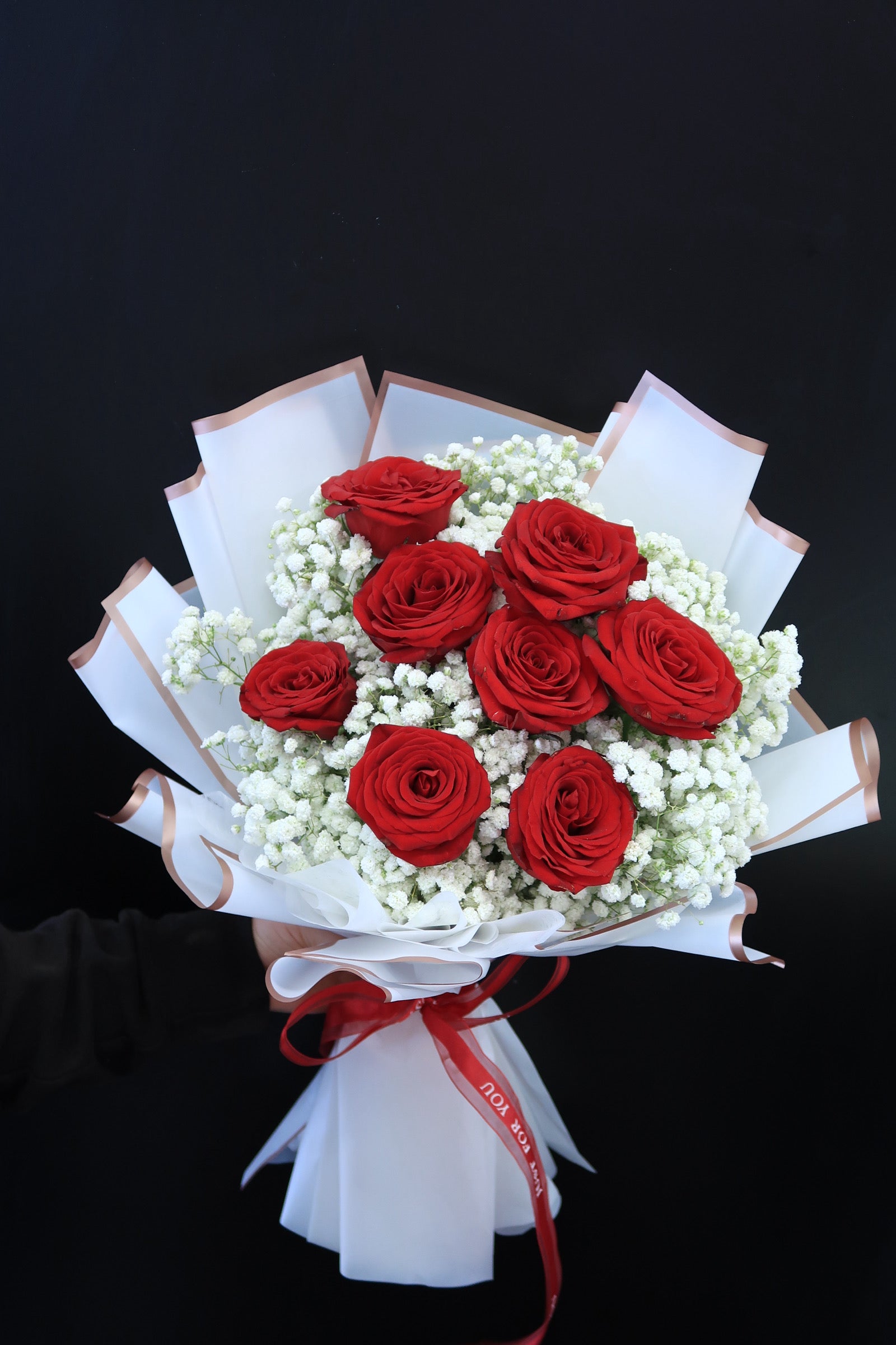 This flower arrangement includes red rose (8 stems), and baby breath.