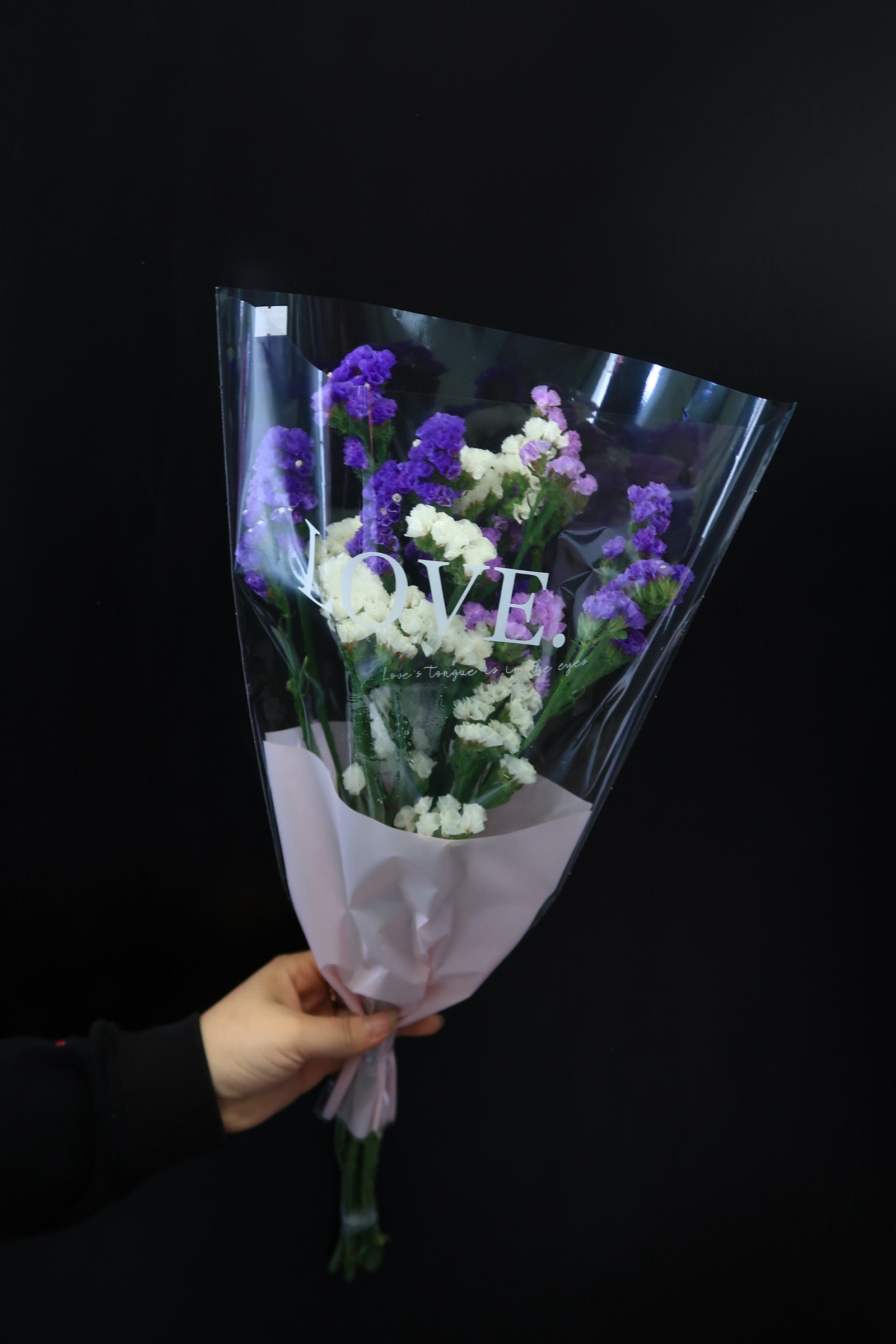 This flower arrangement includes statice (purple & white).