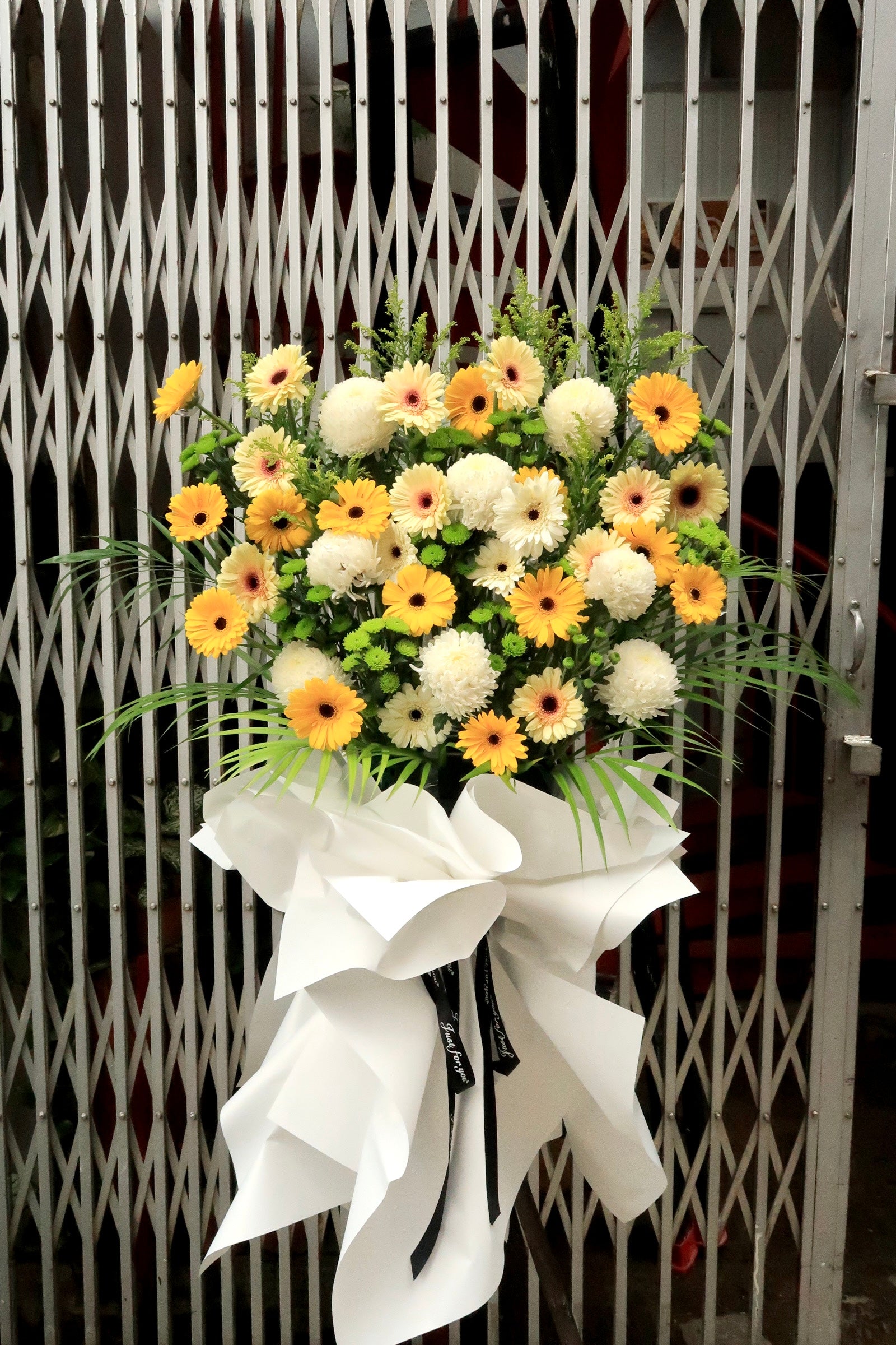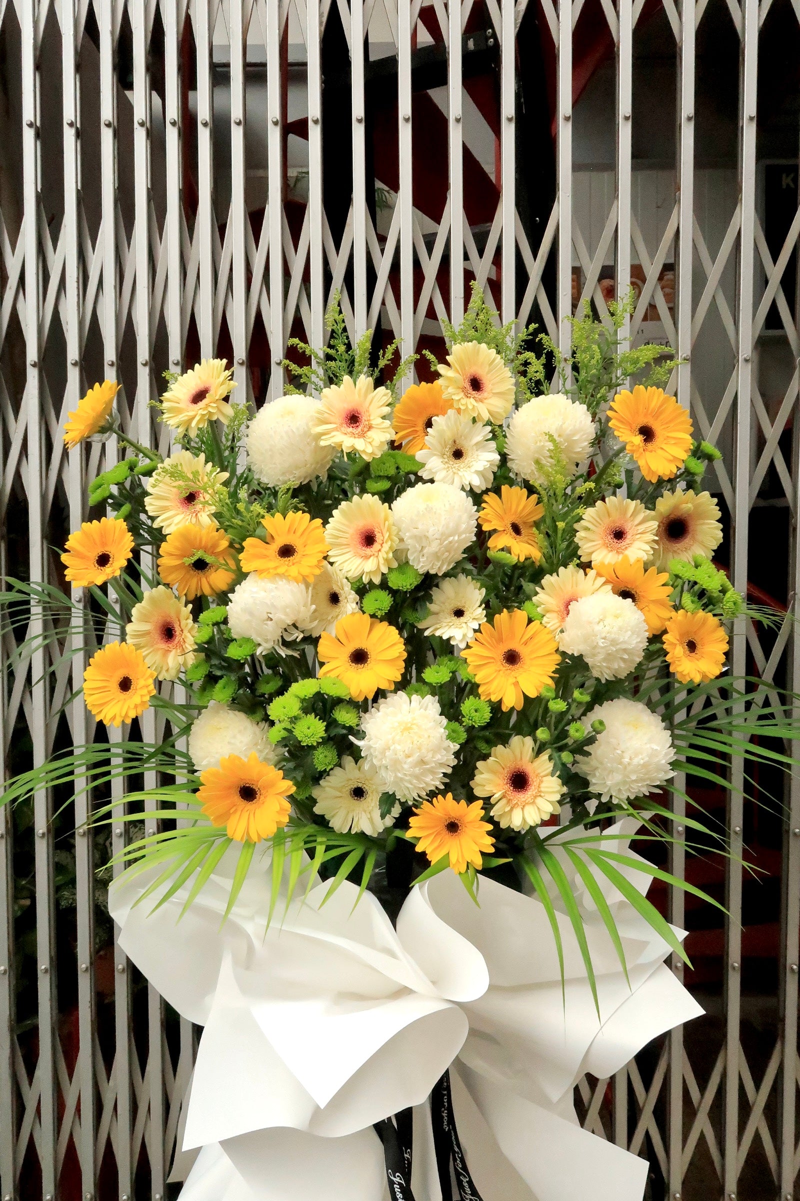 This flower arrangement includes gerbera, chrysanthemum and foliages.