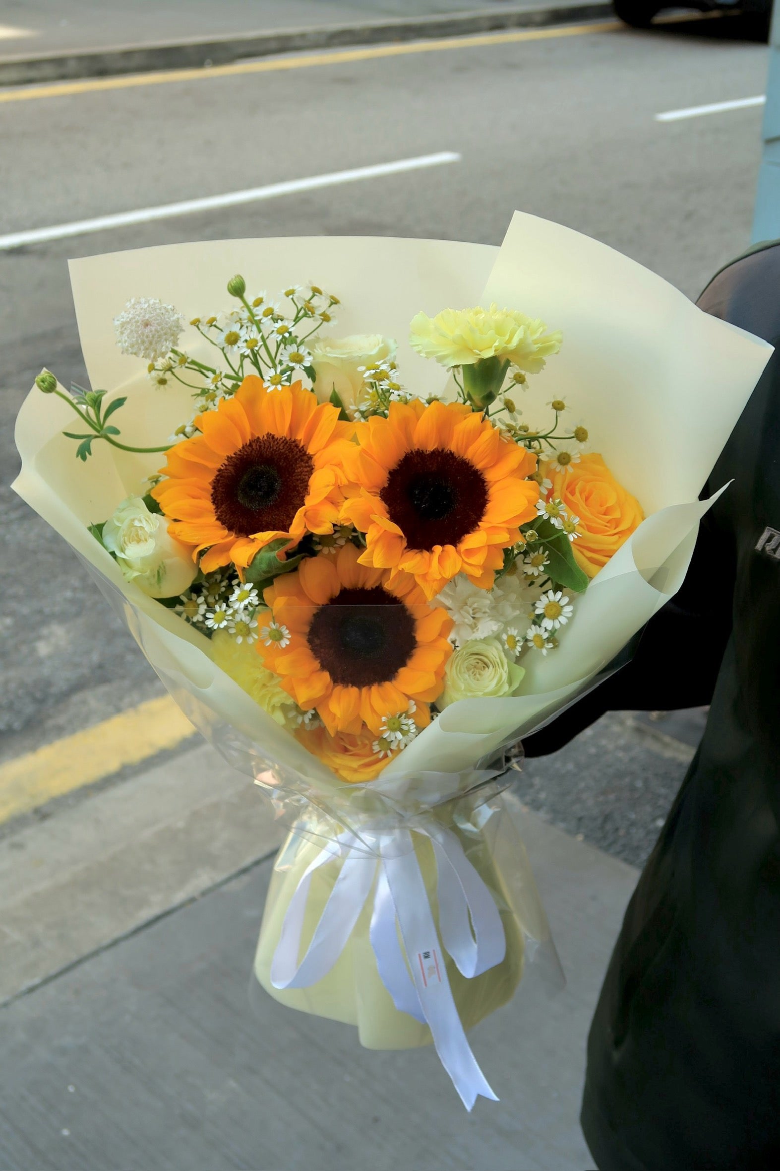 This flower arrangement includes sunflower, chamomile, carnation, rose, lace flower and foliages.