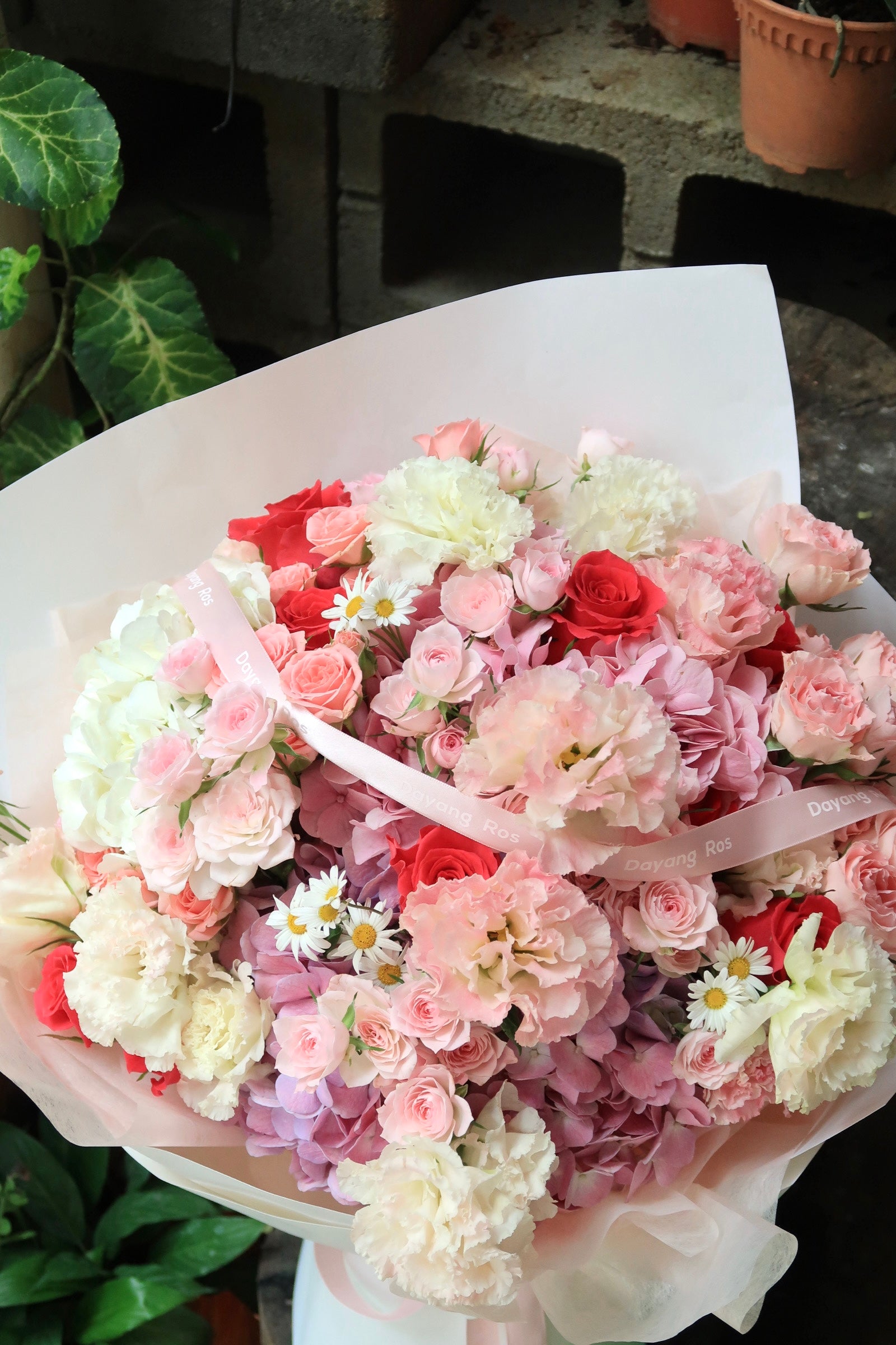 This flower arrangement includes hydrangea, rose (6 hot pink), eustoma, spray rose (Xingyue Baby) and leucanthemum.