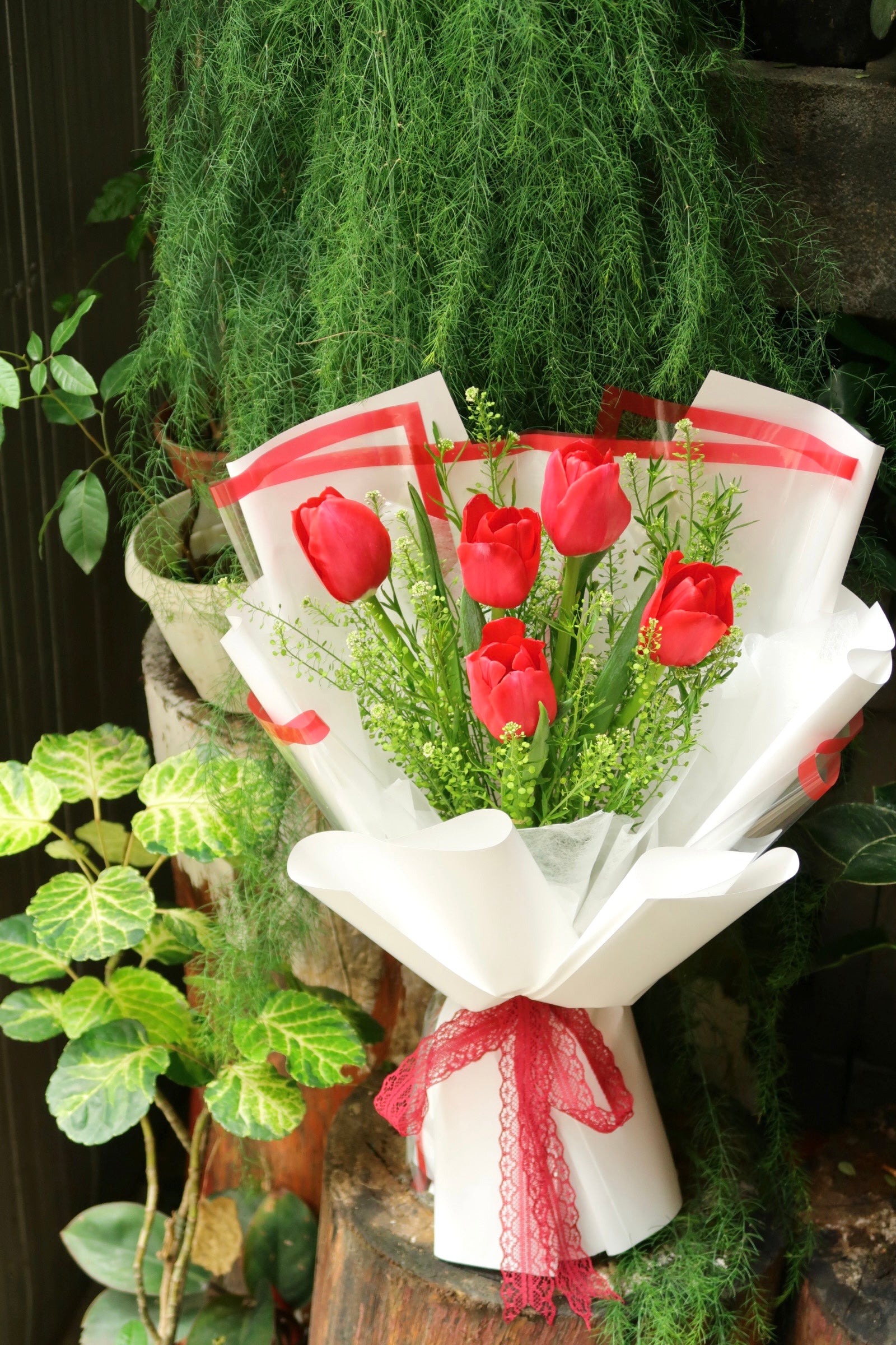 This flower arrangement includes tulips (5 red) and foliages.