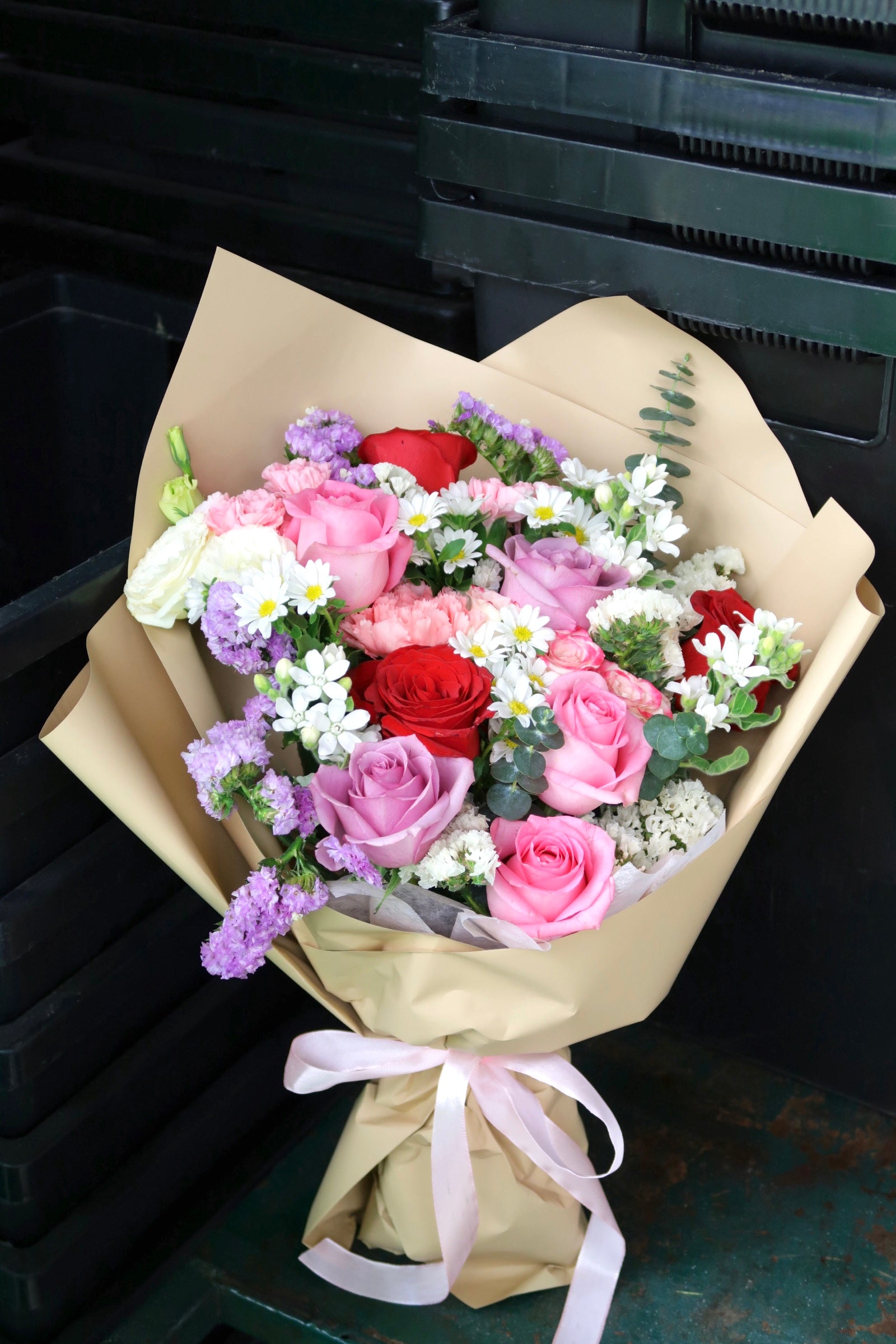 This flower arrangement includes rose (3 pink 3 purple 3 red), spray rose (refringence), carnation, oxypetalum, hana, eustoma and statice.