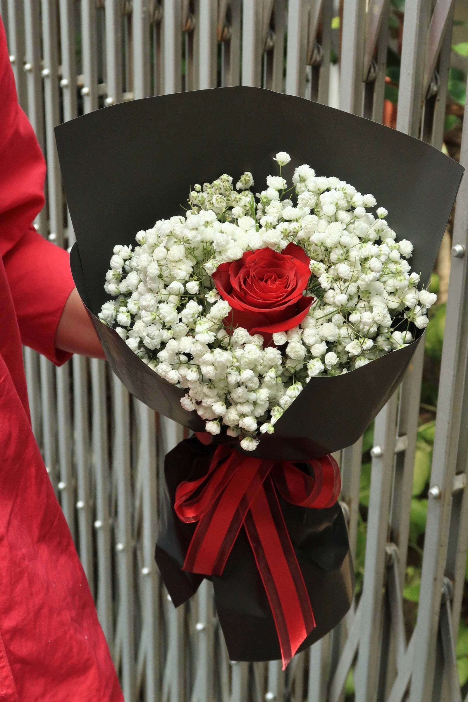 This flower arrangement includes 1 rose and baby's breath.